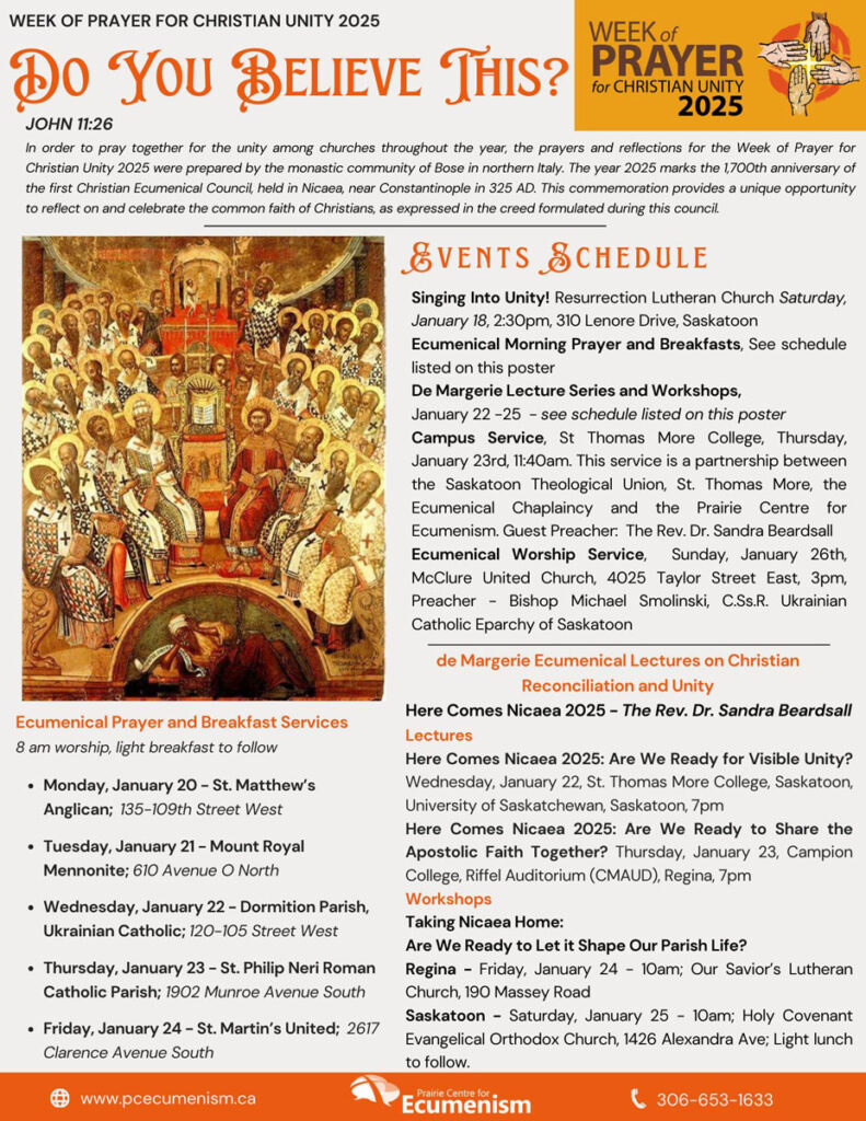 Did you know that 2025 marks the 1700th anniversary of the First Ecumenical Council of Nicaea in 325! Save the Dates and plan to attend the Ecumenical Gatherings in Saskatoon for the Week of Prayer for Christian Unity 2025. On Wednesday, January 22, 2025 you can attend the Ecumenical Service at Ukrainian Catholic Parish of the Dormition of the Mother of God at 8:00am followed by a light breakfast. Bishop Michael Smolinski, C.Ss.R., will be preaching at the Closing Ecumenical Service at McClure United Church at 4025 Taylor Street East in Saskatoon, SK at 3:00pm on January 26, 2025.